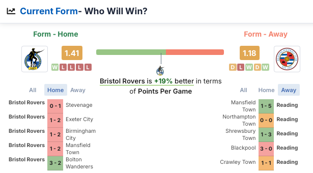 - Home vs Away Stats: Season-long data suggests Rovers score marginally more (+7%) and concede significantly less (-16%) at home compared to Reading’s away averages. However, this clashes dramatically with current form, where Reading are rampant and Rovers are faltering. It highlights Rovers’ past capability at The Mem but underscores their current decline.